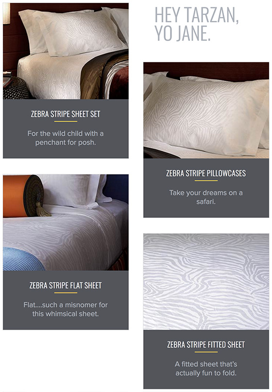 From zebra linens to menswear-inspired bathrobes, Kimpton Style sells the luxe products found in Kimpton hotels around the country. They really let me cut loose with the copy. Being tickled by a three-armed orangutan could not have been more fun.